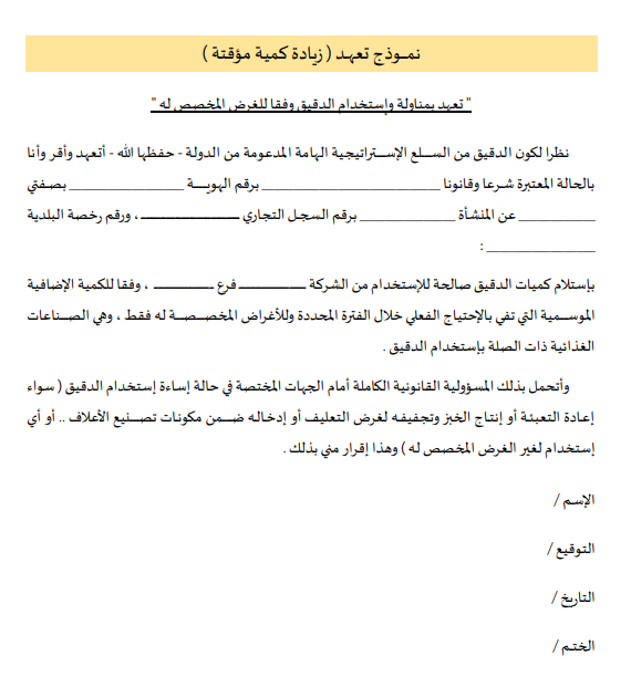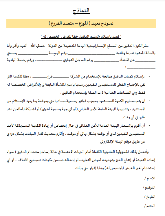 2 - إرفاق نسـ ـخة من ( رخصـ ـة البلدية / أو الترخيص الصــناعي ) ملنشــأة العميل يتضــمن نشاط يتصل بصناعة المخبوزات أو الأغذية ذات الصلة بإستهلاك الدقيق .